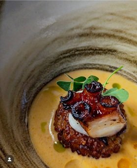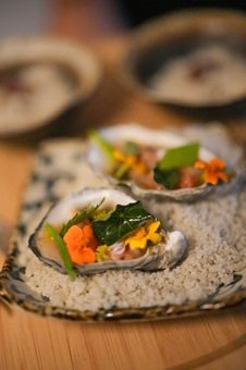 Émoi chaud froid et grand bonheur engagé, sa cuisine virevolte entre piments d’ici et poivres de là, poissons de Méditerranée, algues, kochugan, Mirin et végétal inspiré.